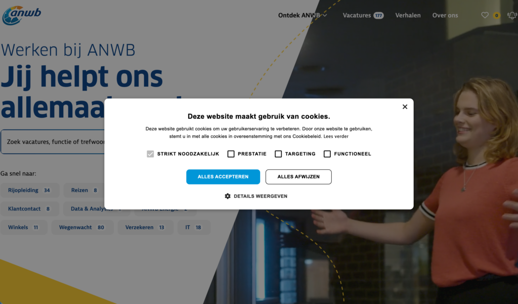 De eerste indruk op Werken bij ANWB: wij willen dat je alle cookies accepteert: