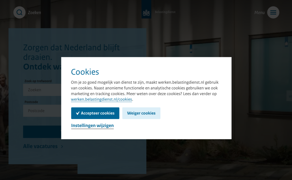 Dat is niet het geval. De aandacht van bezoekers van de werken-bij website wordt in de meeste gevallen gericht op de cookiebanner of -melding. De poging om toestemming voor gebruik van niet-noodzakelijke (marketing, tracking) cookies te verkrijgen.