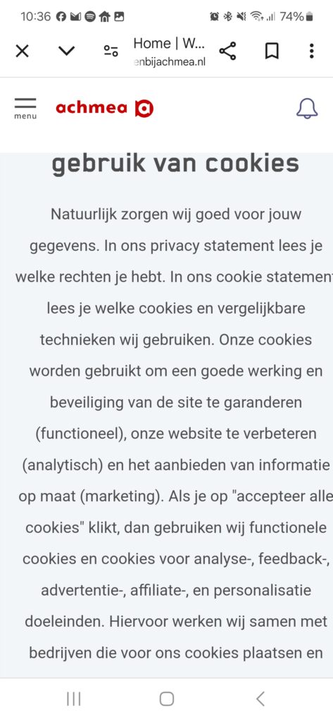 De eerste indruk op Werken bij Achmea (mobiel): enkel aandacht voor cookies waarvan Achmea graag heeft dat je akkoord geeft: