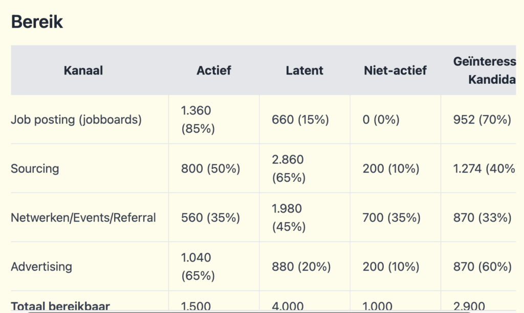 Voor de doelgroepen (op reisafstand van de vacature-locatie) wordt een inschatting gemaakt van de aantallen (geinteresseerde) kandidaten die via verschillende wervingskanalen bereikt kunnen worden: