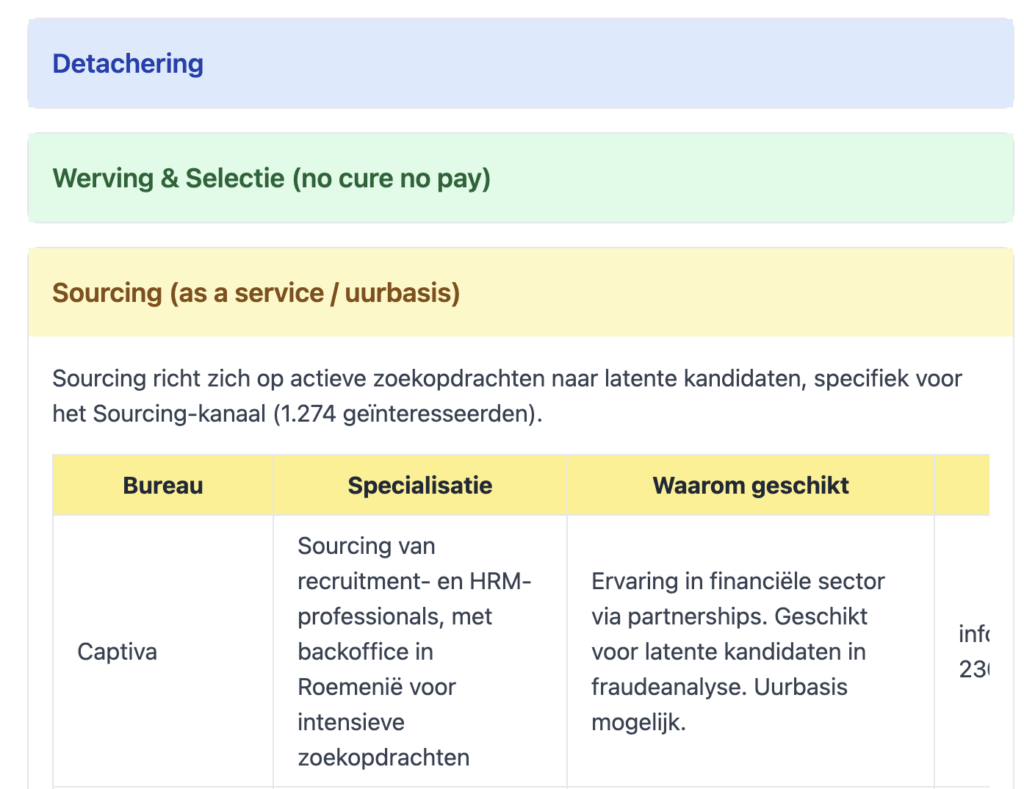 Zoek je naar een oplossing om de vacature te vervullen? In de analyse worden gespecialiseerde (lokale) bureaus weergegeven die werving & selectie, detachering, sourcing of interim recruitment aanbieden met specialisatie en ervaring in doelgroep en sector: